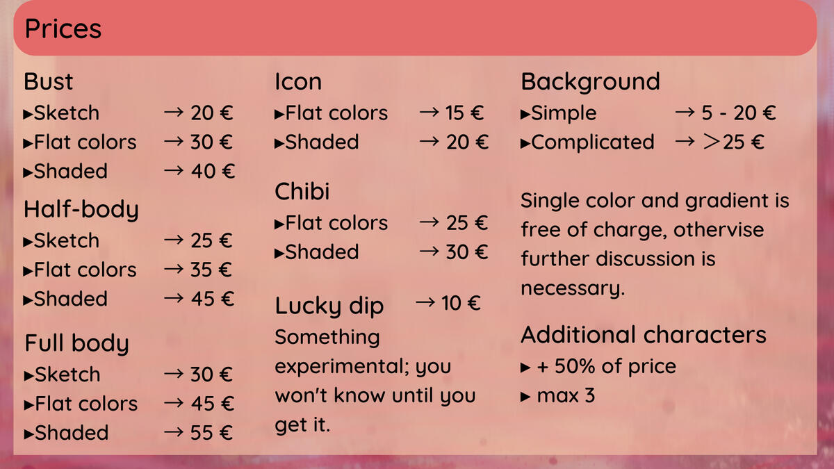 After your affirmation of the commission request, I'll consider my TOS to have been read, understood, and acknowledged.ARTWORK DIMENSIONSResolution: 300 dpiCanvas size: depends on type of commission, will be discussed before starting the drawingColor profile: RGBI'm working digitally, and I intend my works for computer-distribution only. You can request CMYK profile, but you'll need to state for what purpose.File format: PNG, negotiablePAYMENTPayment currency: EuroPayment method: via ko-fiPayment time is after the finalized sketch, or after the piece is done, in which case the quality of the progress shots will be deliberately reduced. After payment has been transferred, I'll send you the finished drawing.CONTENTI'm willing to draw adult themes, though I will require an affirmation of your true age.