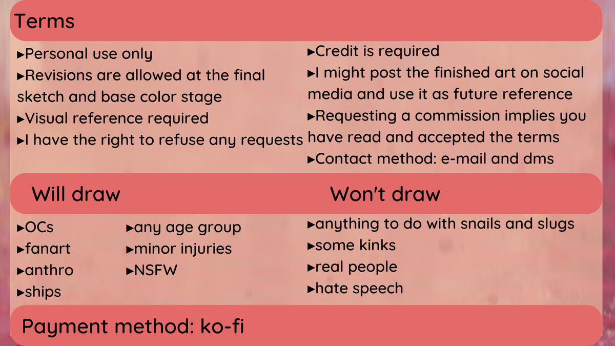 Commission status: OPENSlots: 0/5Time: 1-5 weeks